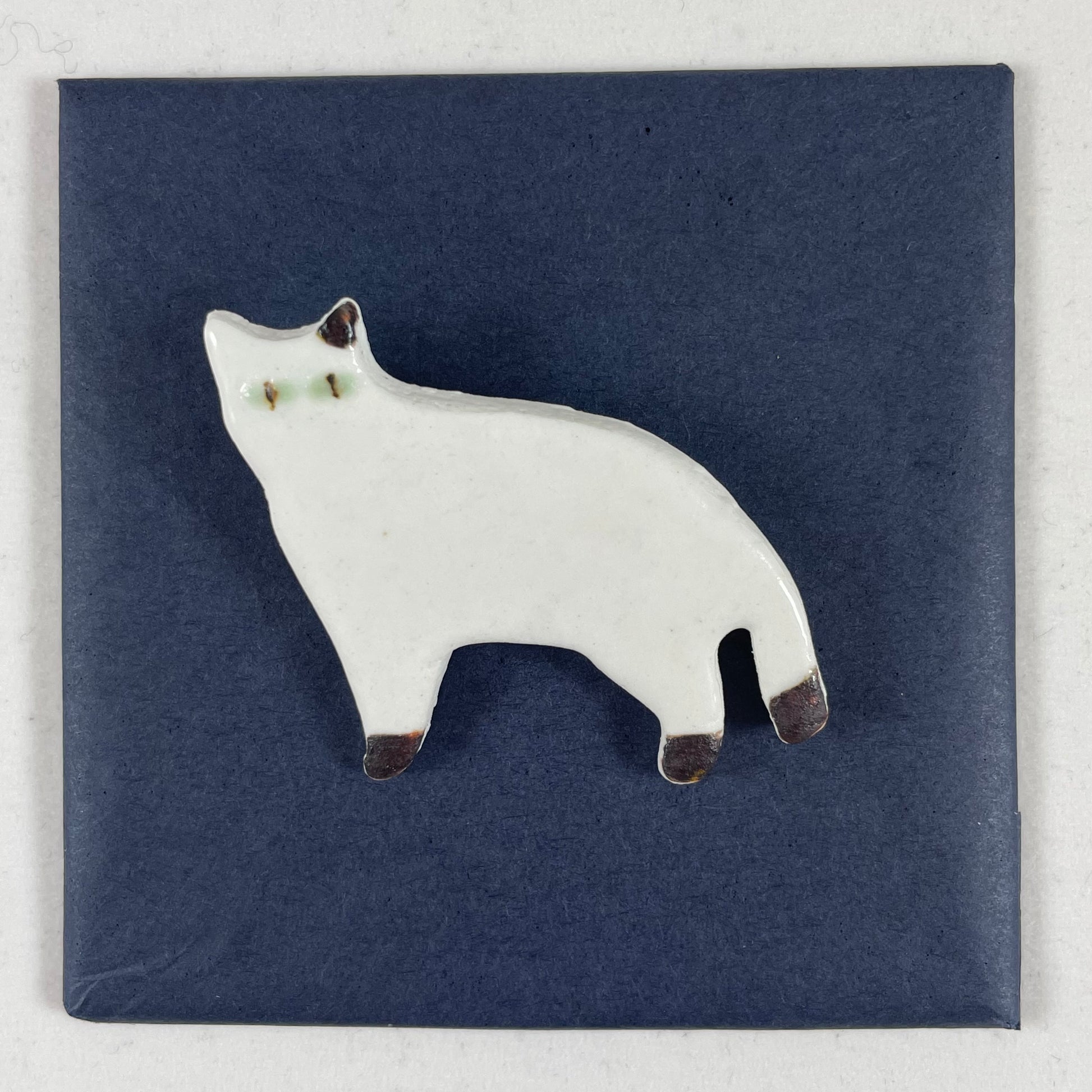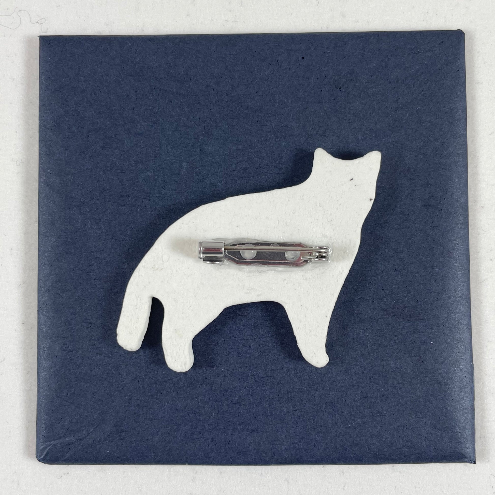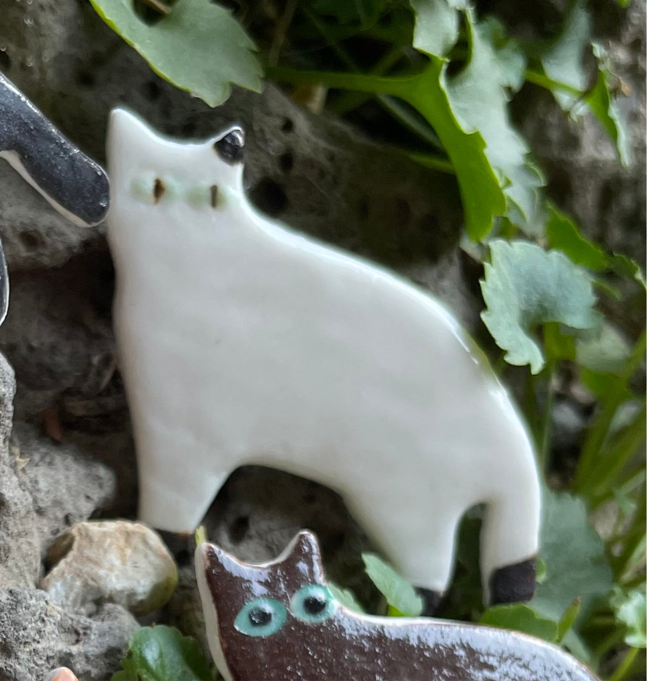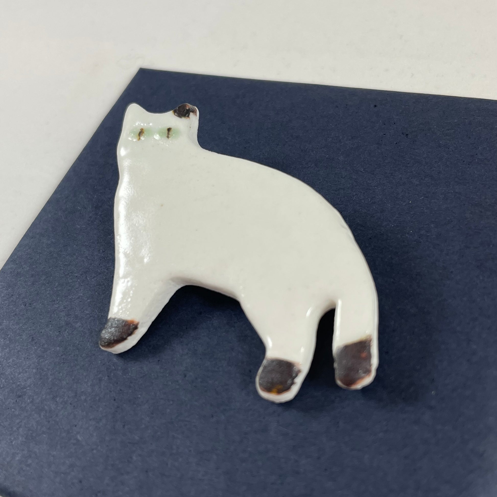 Cute cat brooch made from lightweight porcelain. Shiny glaze and pale green eyes. Black feet, tail and ear add personality.