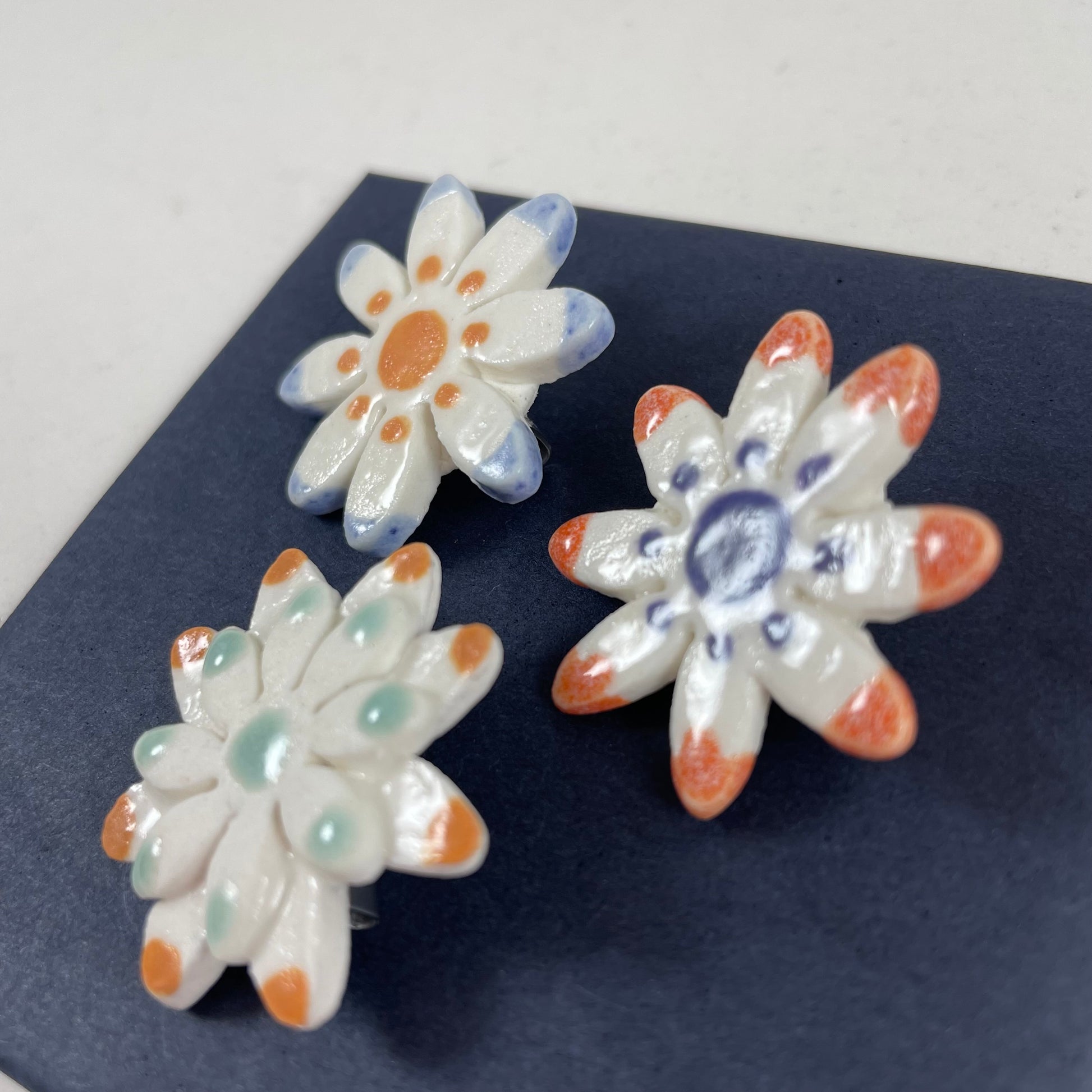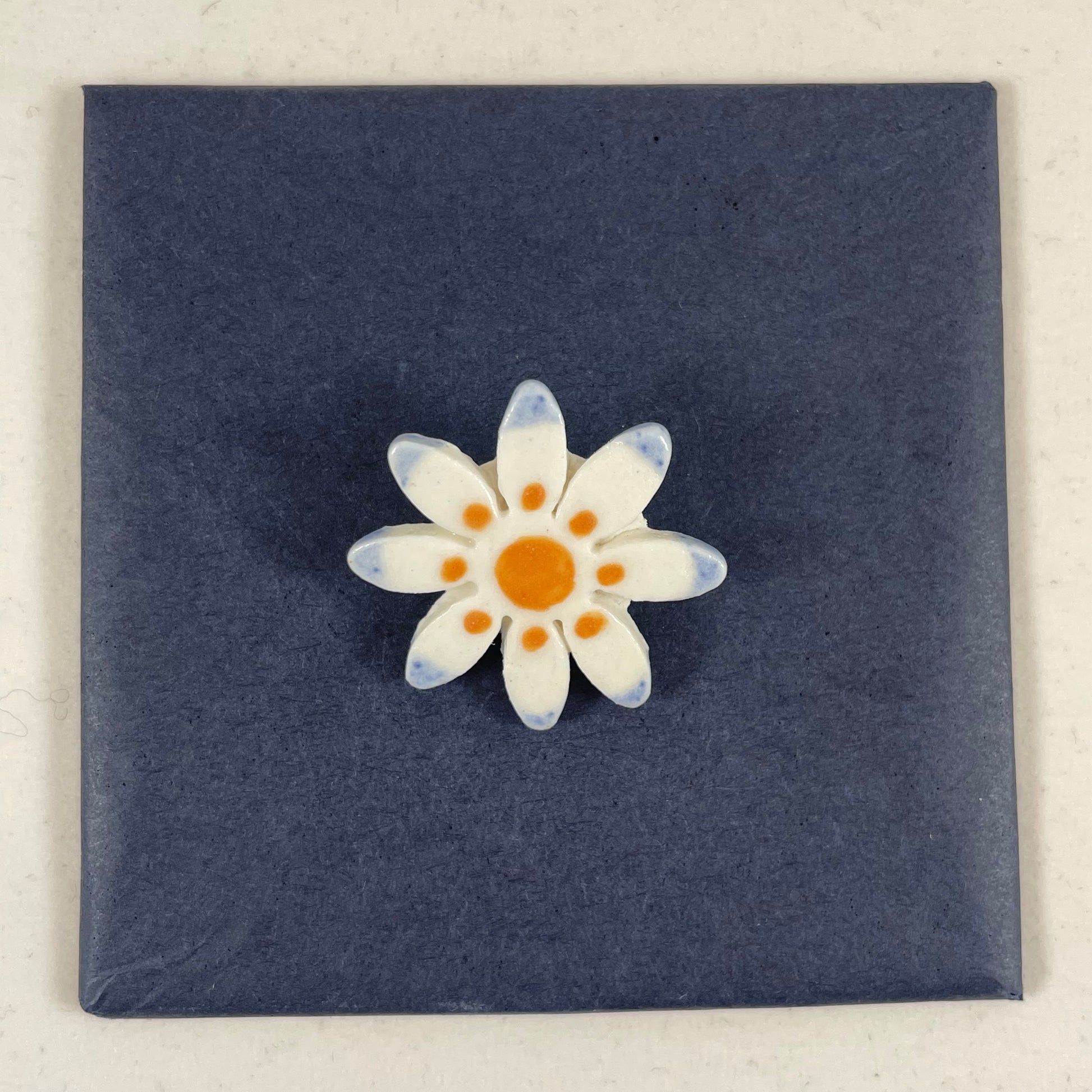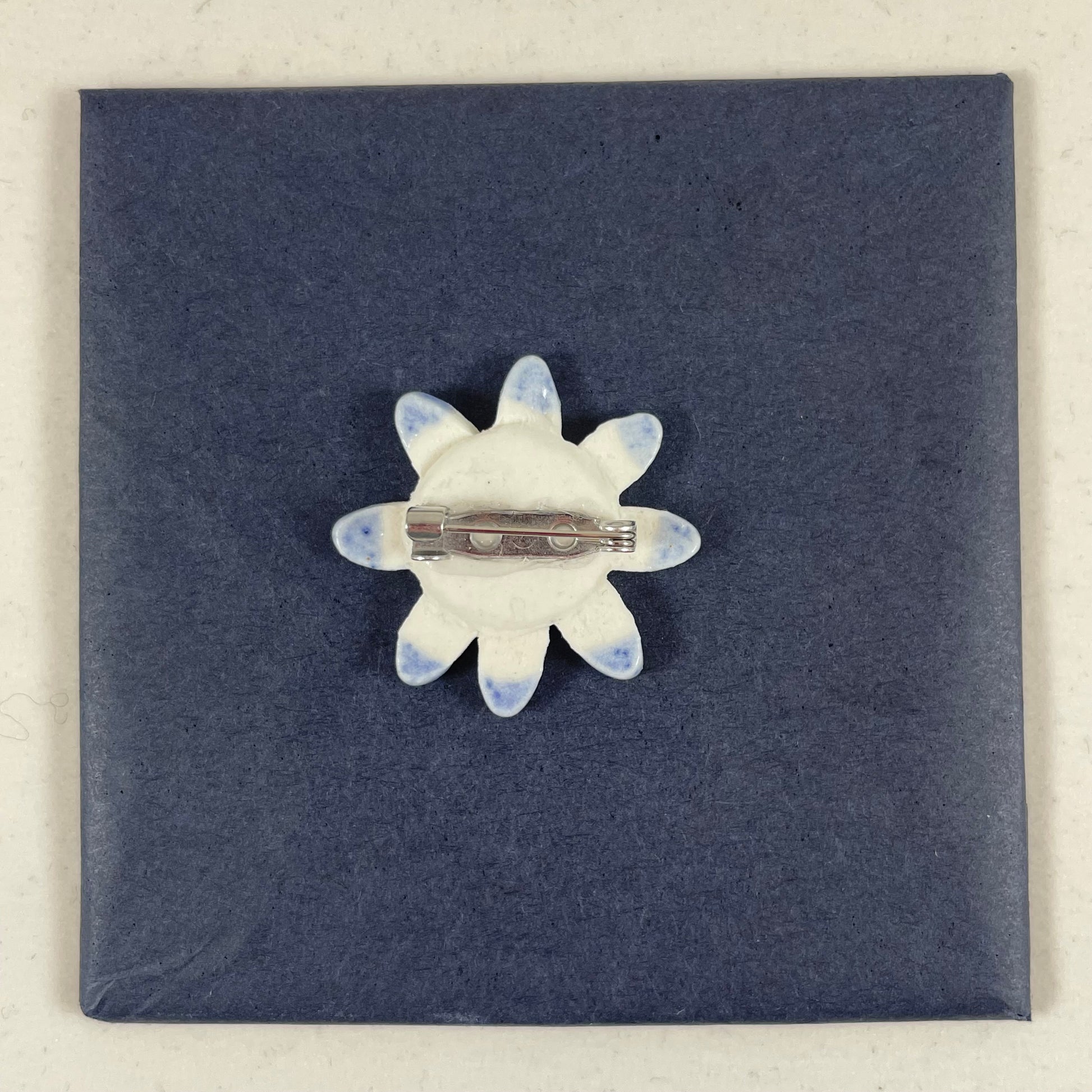Cute daisy brooch. Made from lightweight porcelain. Hand painted in pastel blue and orange glazes.