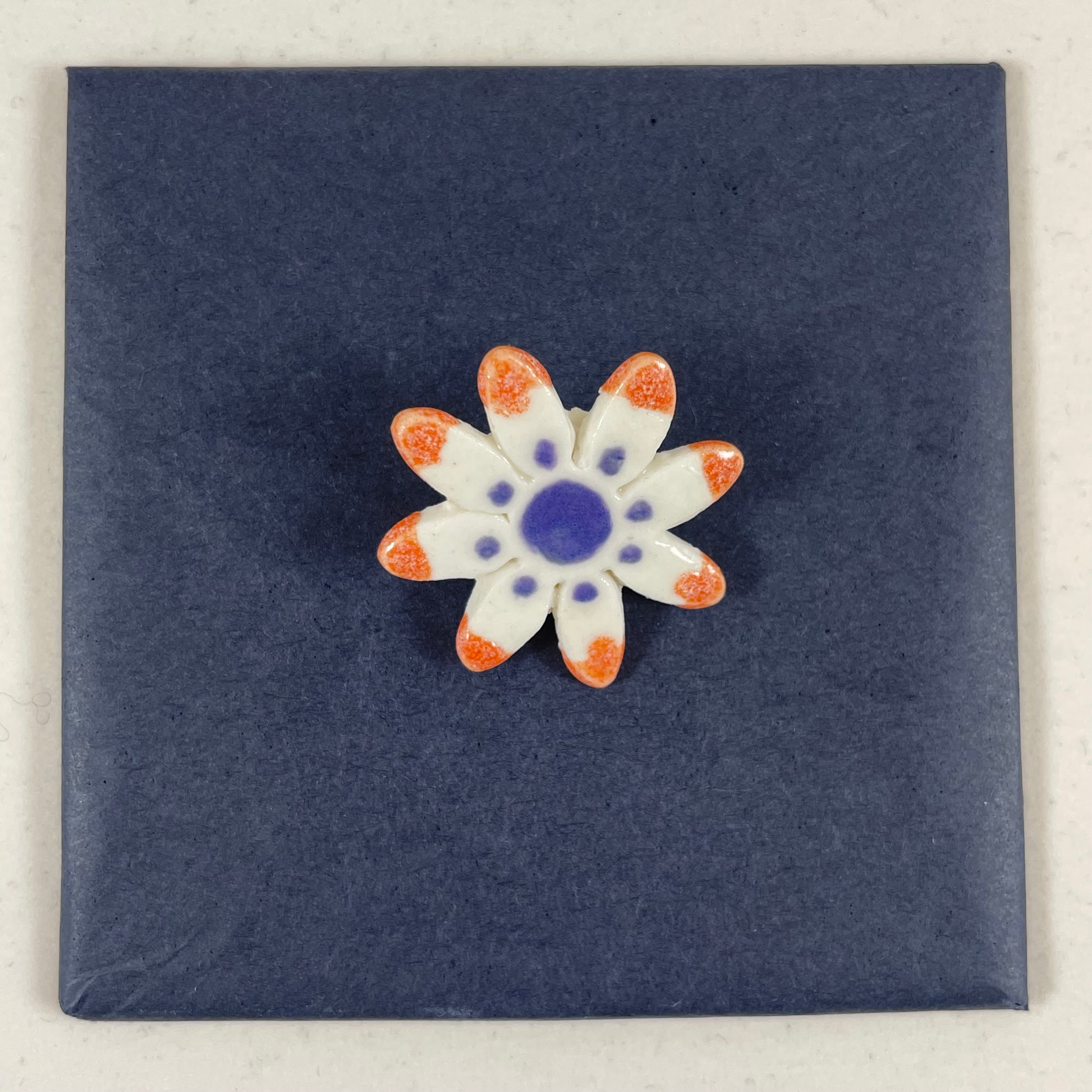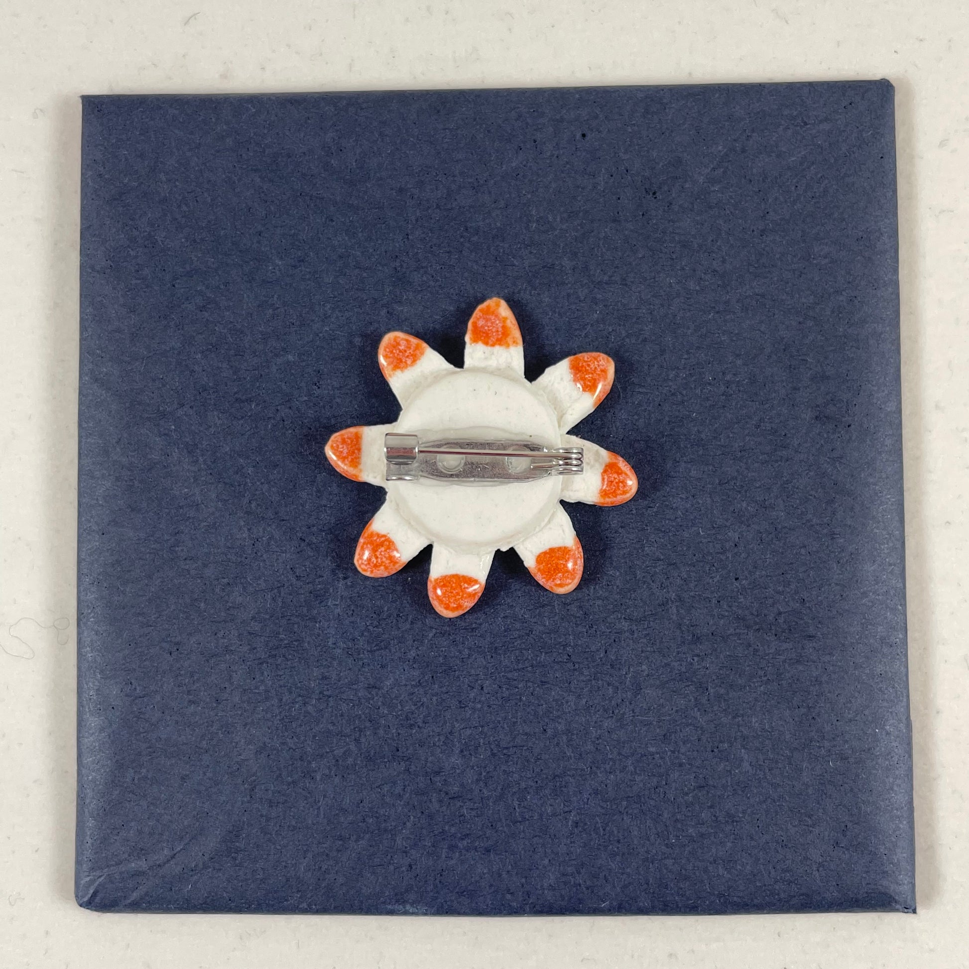 Cute daisy brooch. Made from lightweight porcelain. Hand painted in lavender and orange glazes.