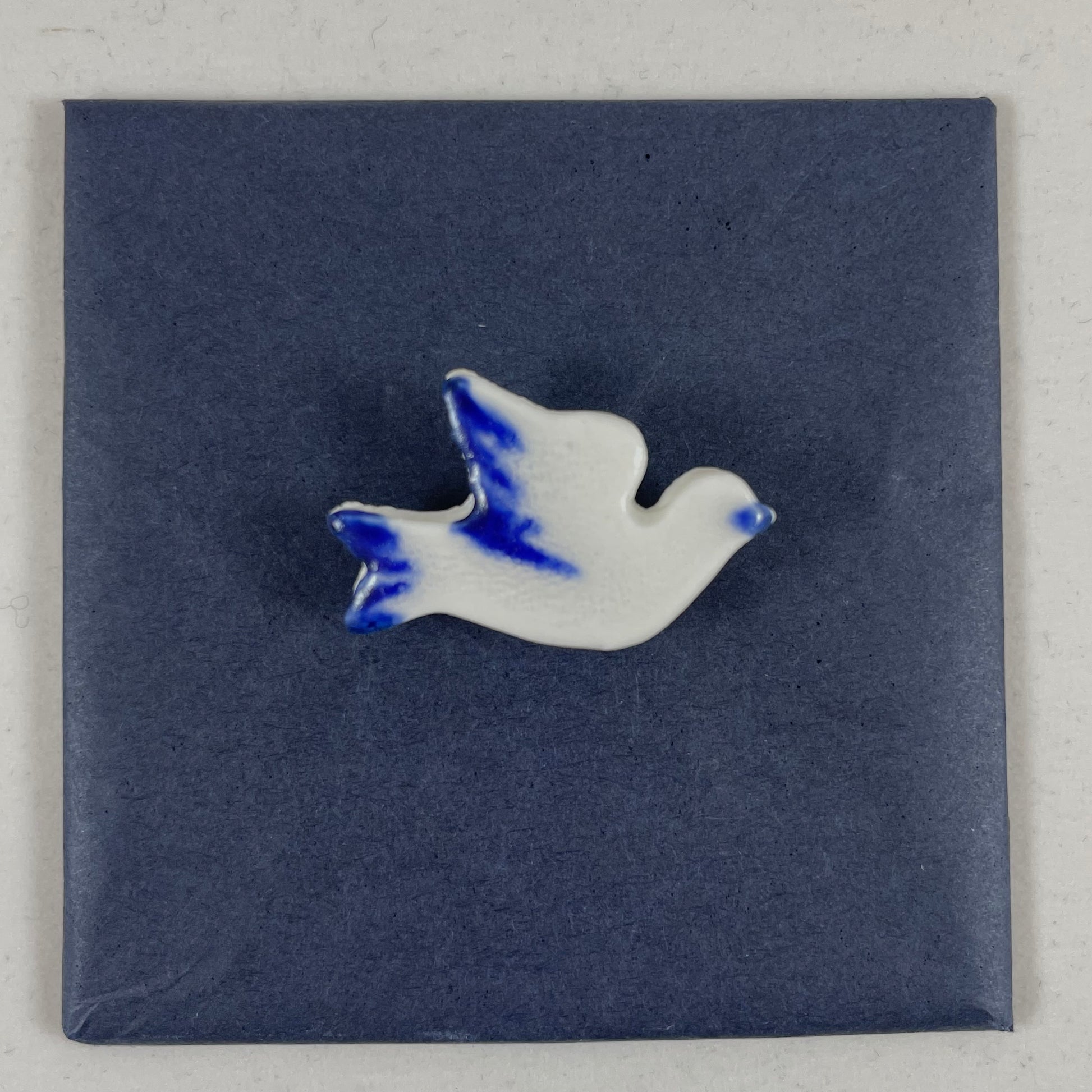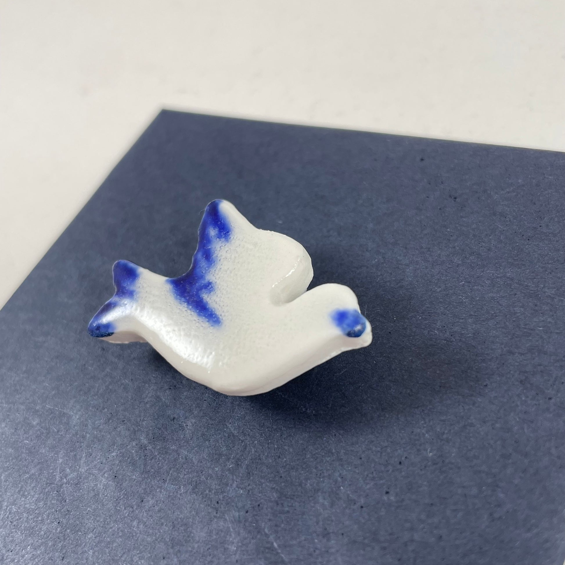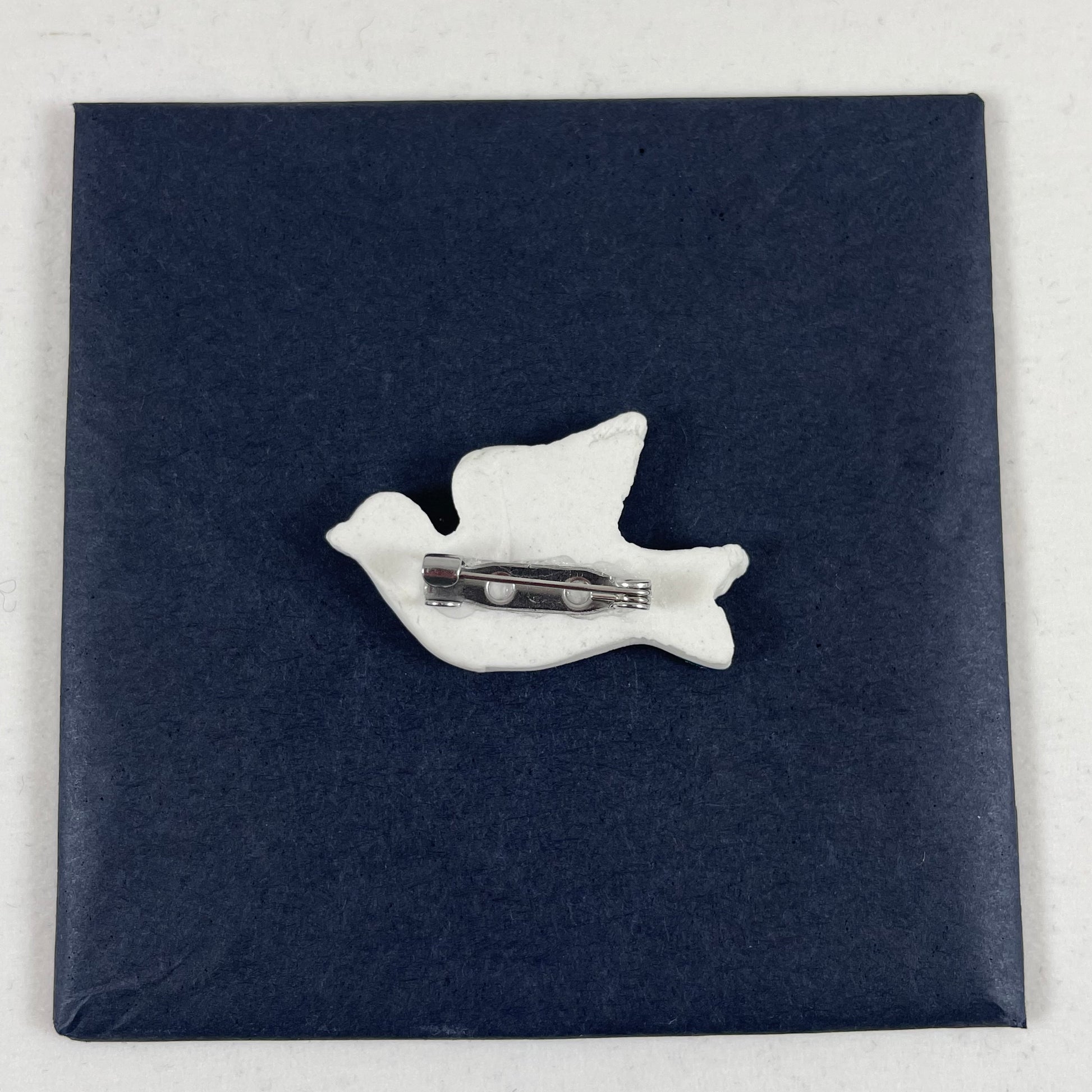 Gorgeous dove brooch made from lightweight porcelain. Shiny finish and striking blue glaze. A symbol of peace.