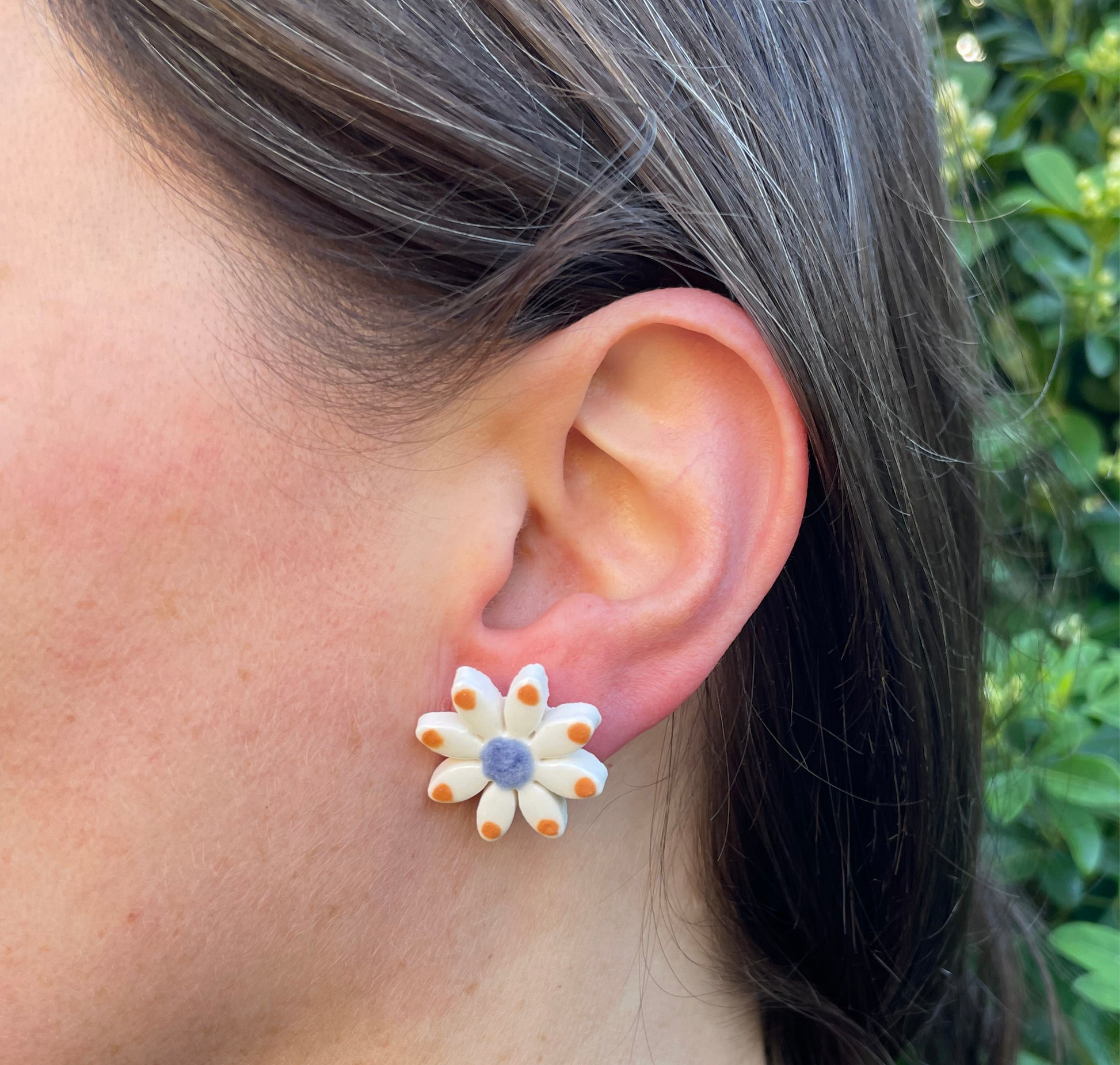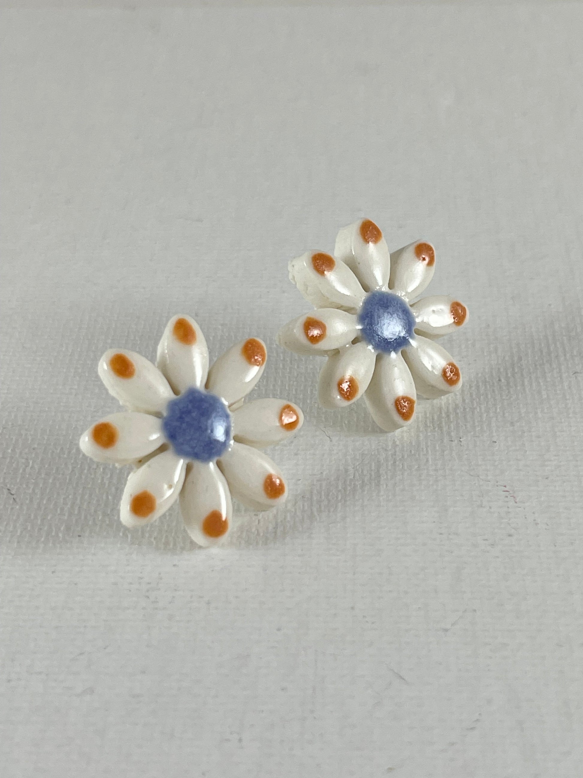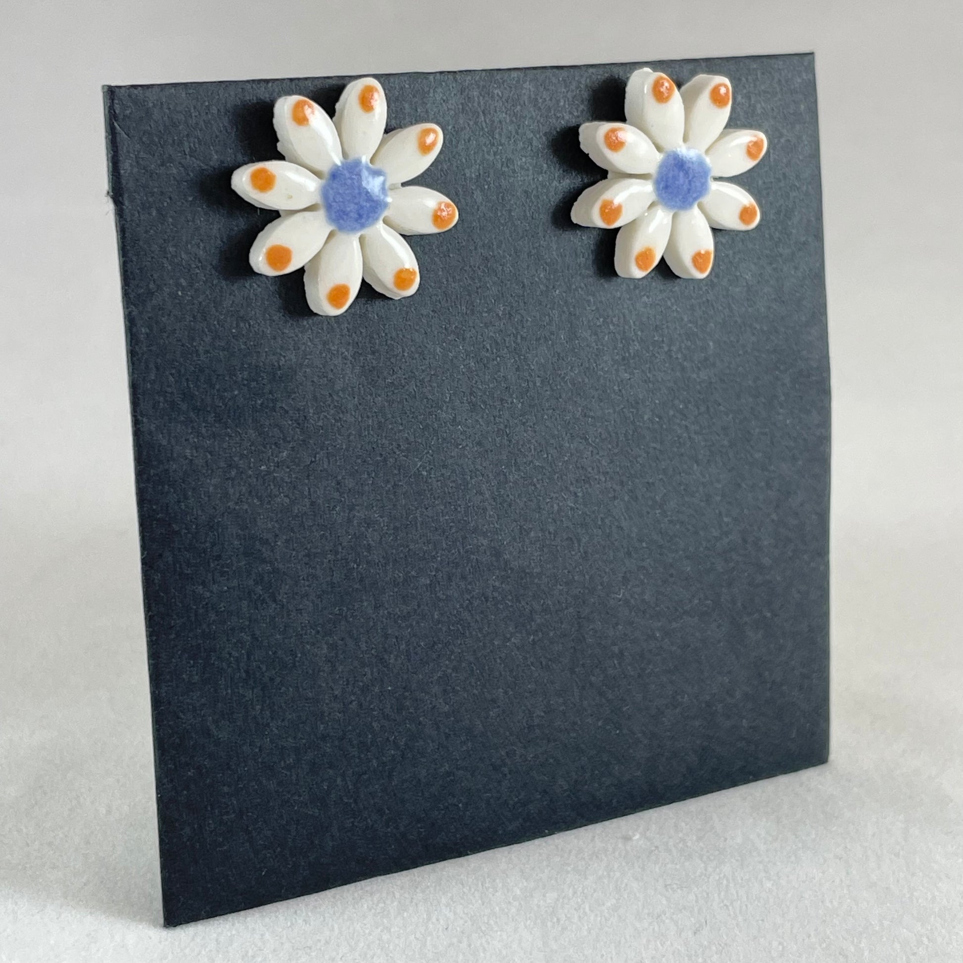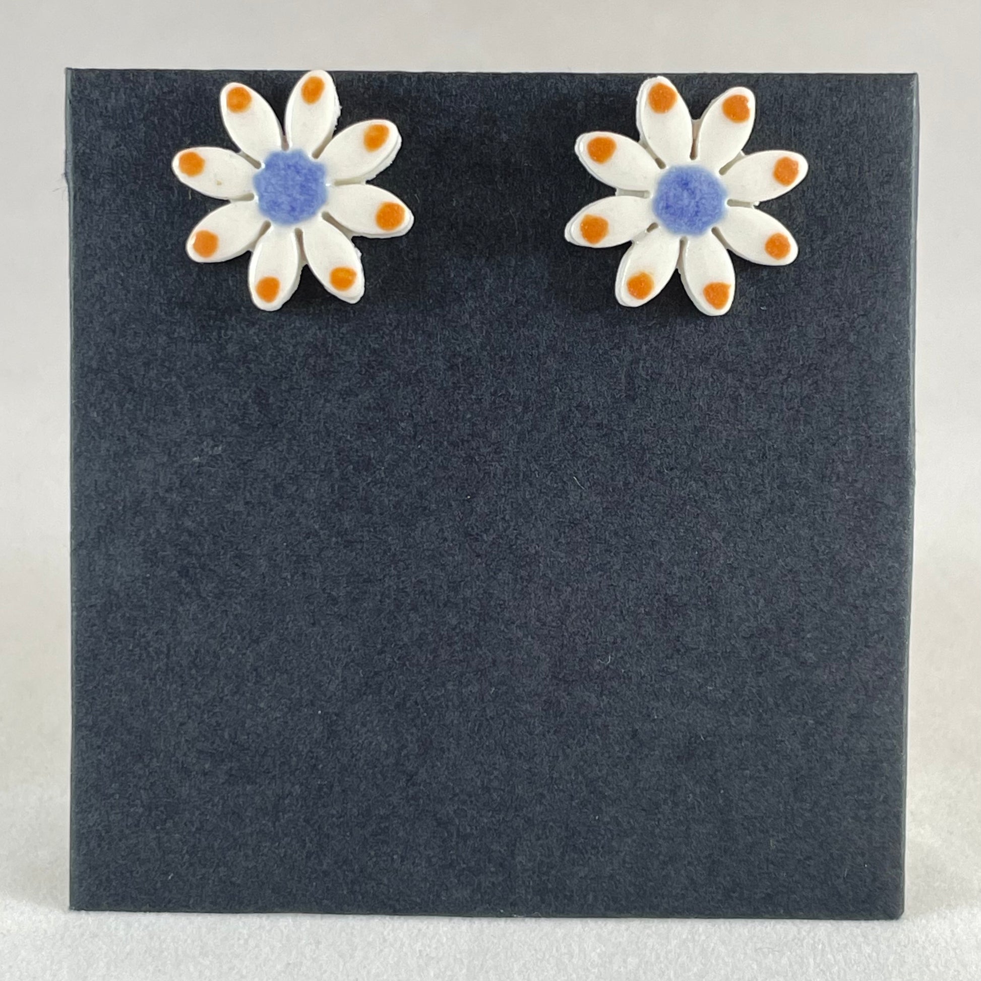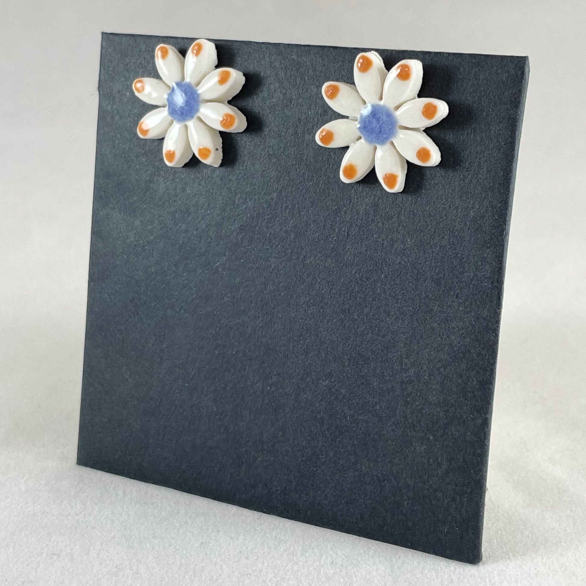 Daisy stud earrings. Hand-painted using striking orange and blue glazes. A cheerful colour combination.