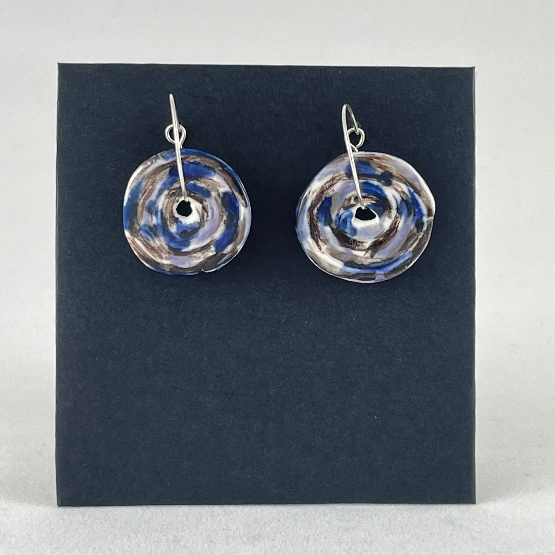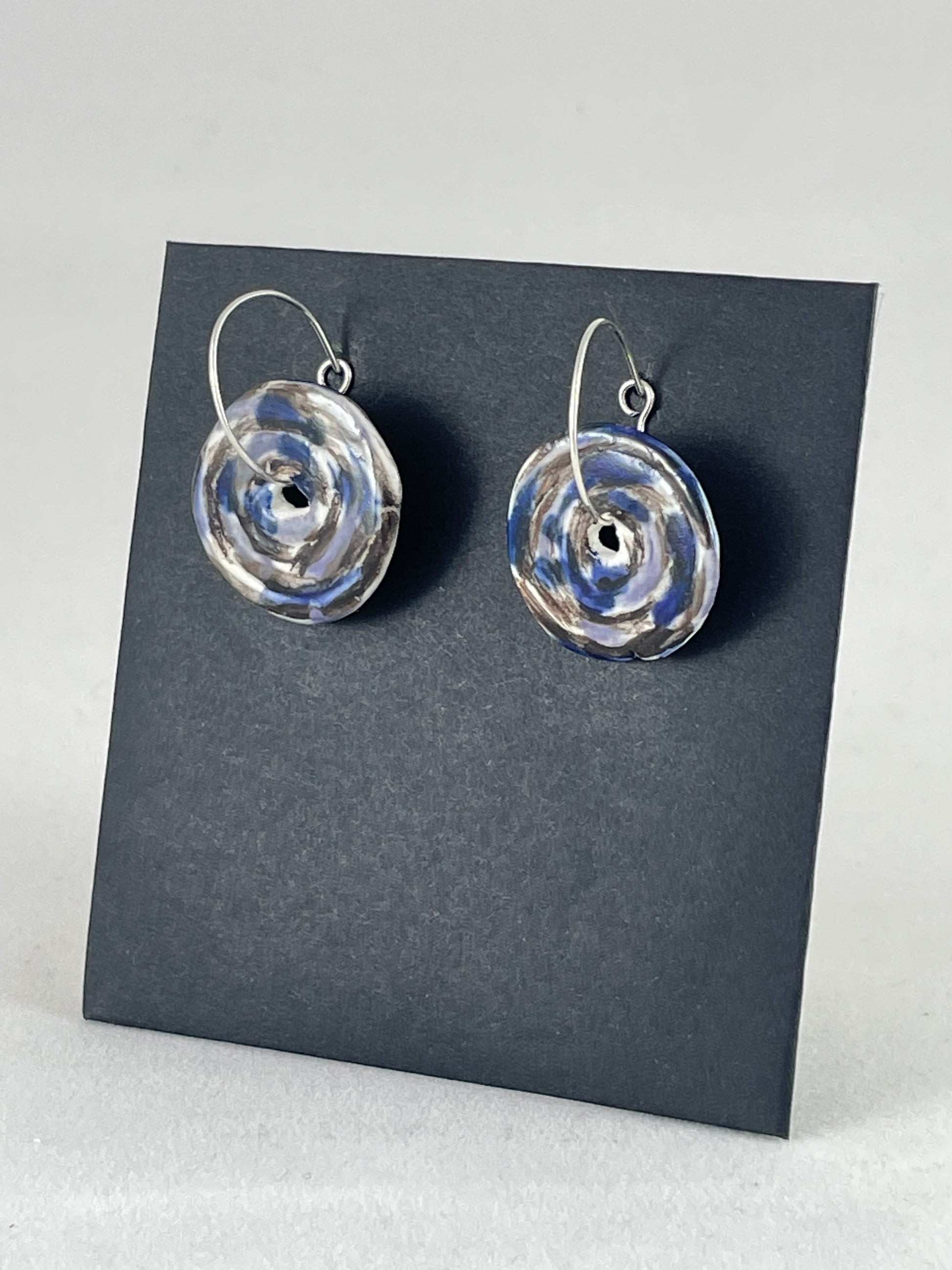 Abstract floral pattern, painted with loose brush strokes. Hand coiled porcelain earrings in blue, lavender, black and white.