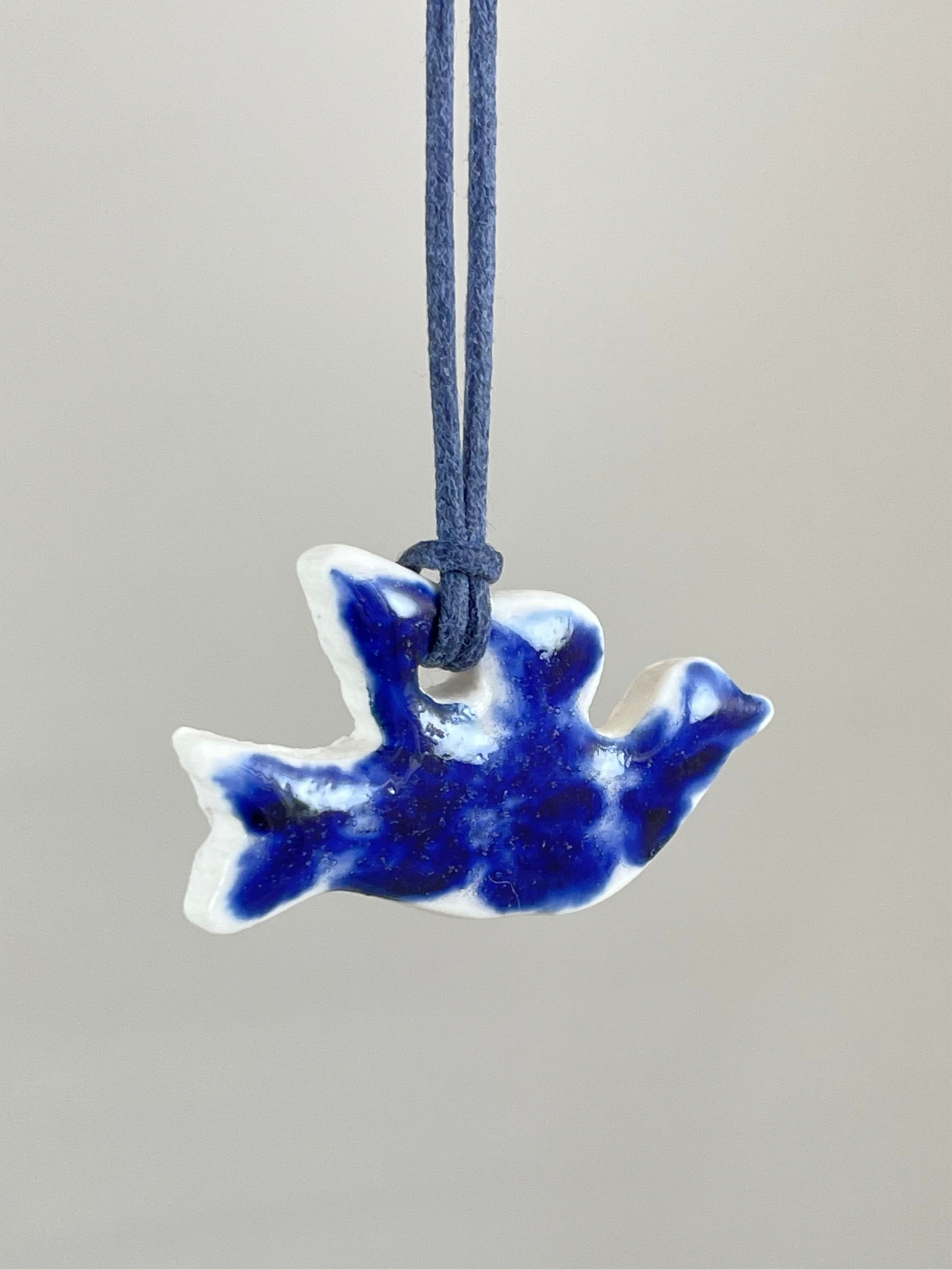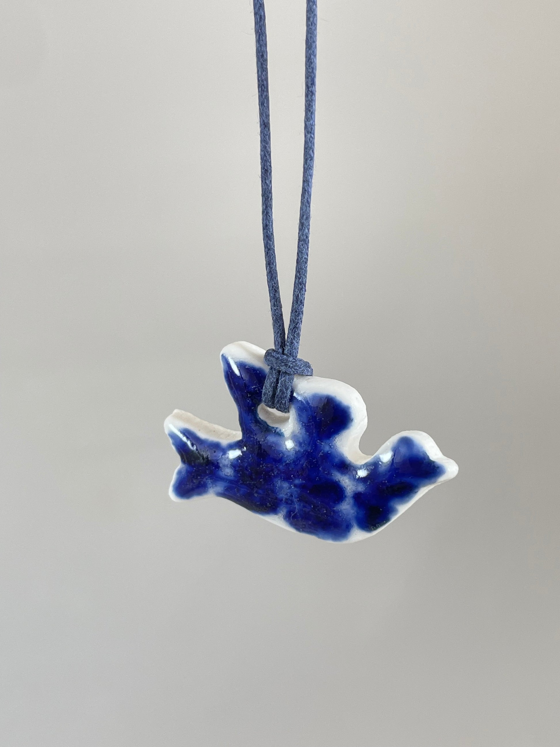 Dove necklace made of lightweight porcelain. Fine cotton thread can be adjusted to wear short or long.