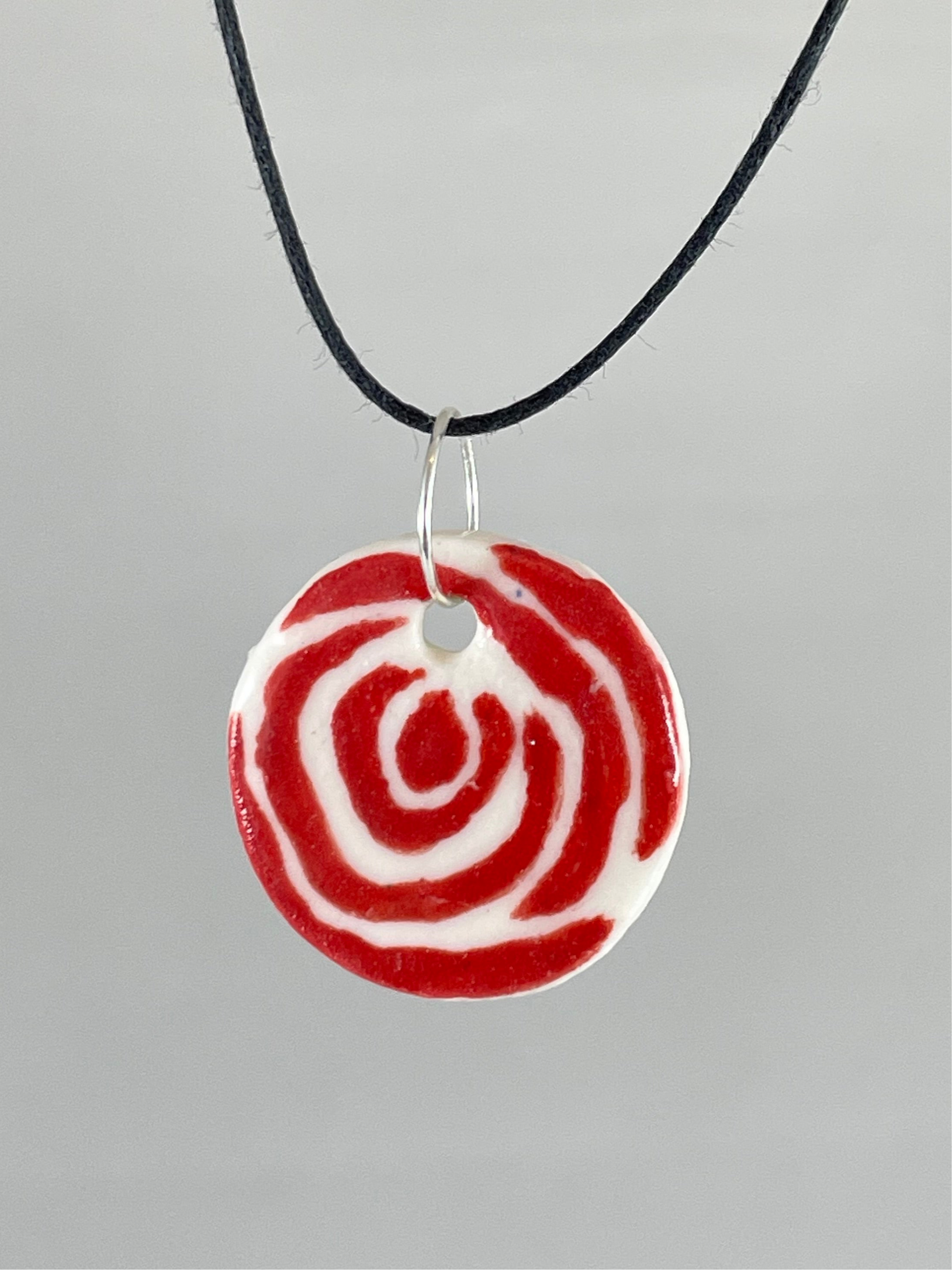 Small hand painted porcelain necklace in red and white, inspired by roses.