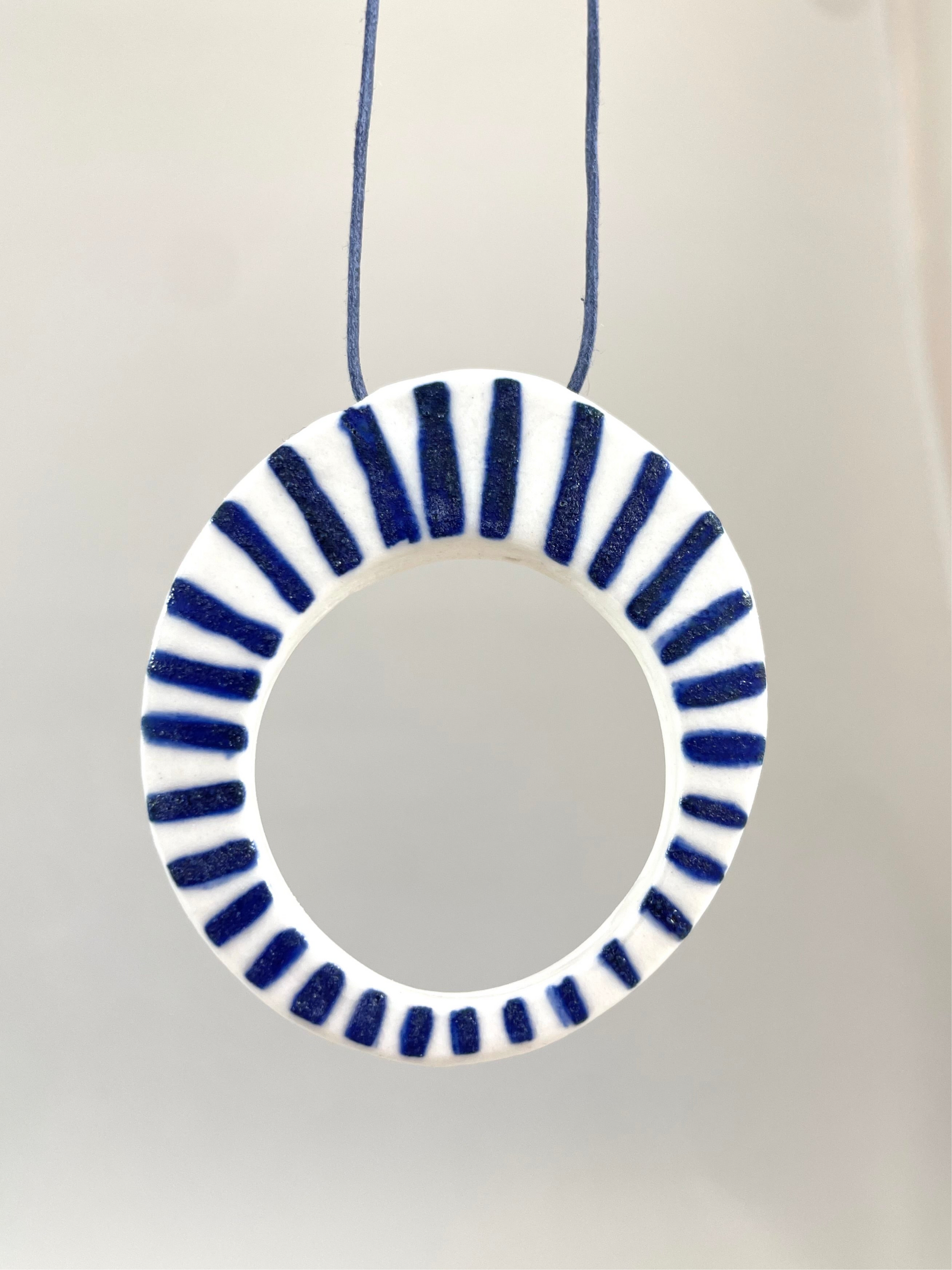 Fun and bold oversized pendant made of lightweight porcelain. Hand painted pattern in blue and white.