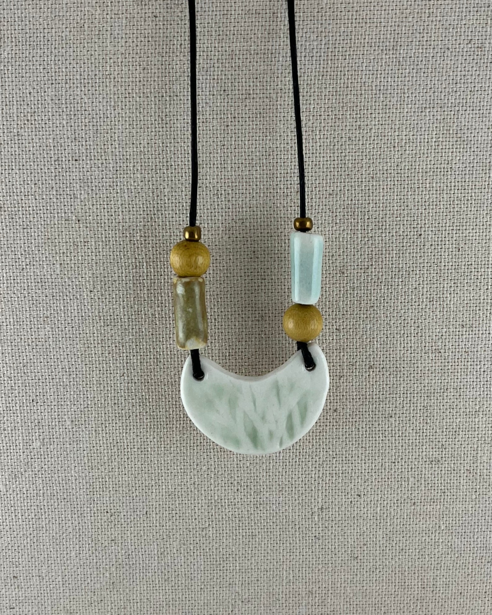 Porcelain necklace with crescent moon-shaped design. Intricate surface pattern of leaf veins.