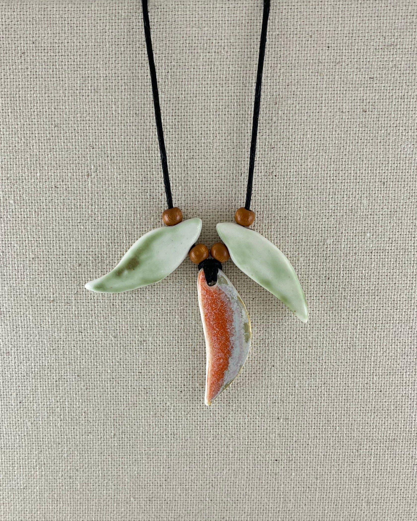 Porcelain necklace with delicate gum leaf design. Natural colours with a striking pop of orange glaze.