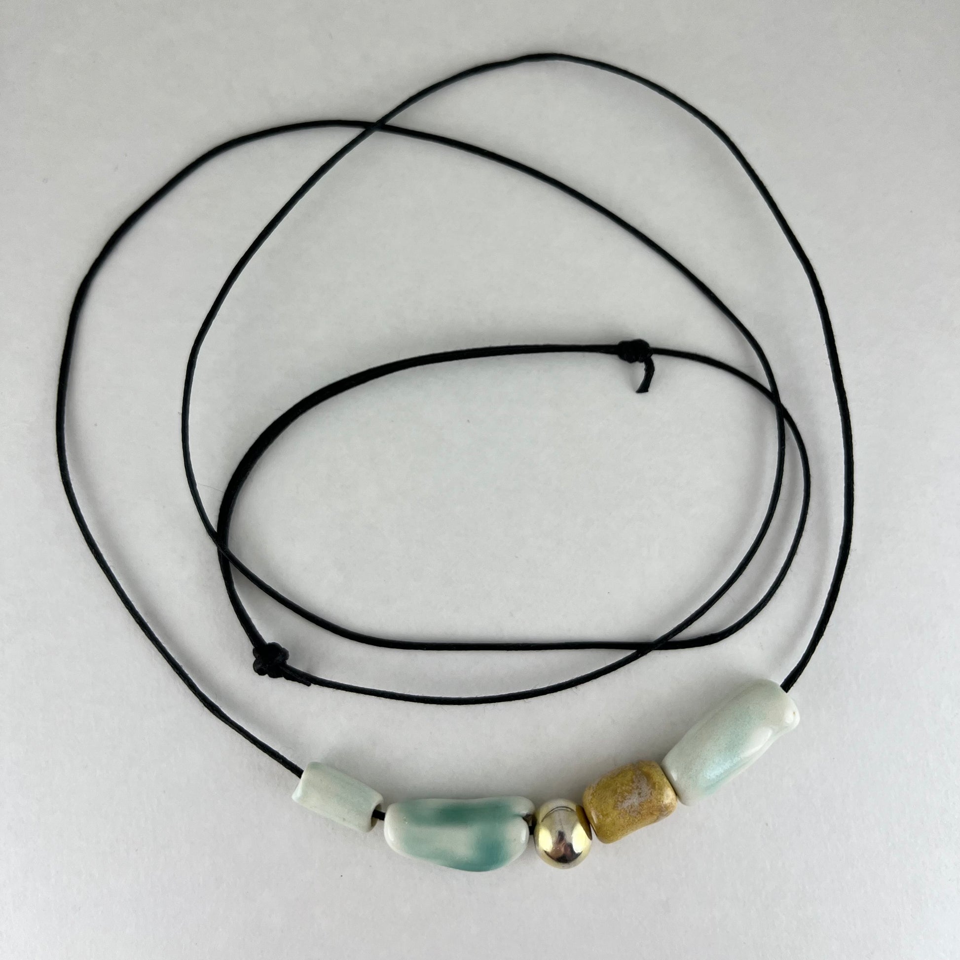 Beaded necklace made of lightweight porcelain. Fresh minty green and warm golden brown glazes.
